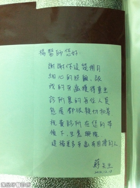 謝謝你這幾個月的照顧,讓我的牙齒獲得重生.診所裡每個人員態度都很親切和善,助貴診所在您的帶領下