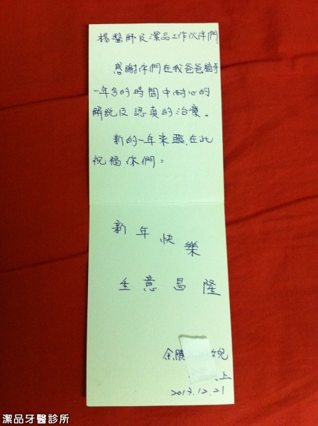 感謝你們在我爸爸植牙一年多的時間中耐心的解說及認真的治療.