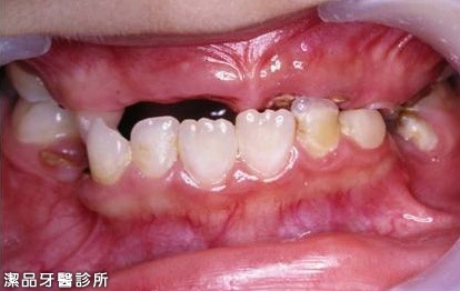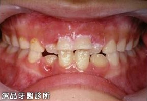 治療方式: 因為爸比媽咪疏忽未及時拔除乳牙,導致上顎門牙錯咬,照片可見口腔衛生不佳。