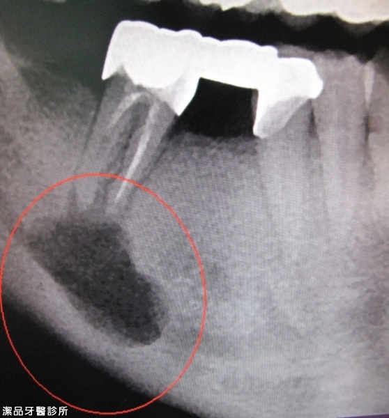 治療後 (ㄧ年後) 重新根管治療+台大手術一年後可見齒槽骨修復中